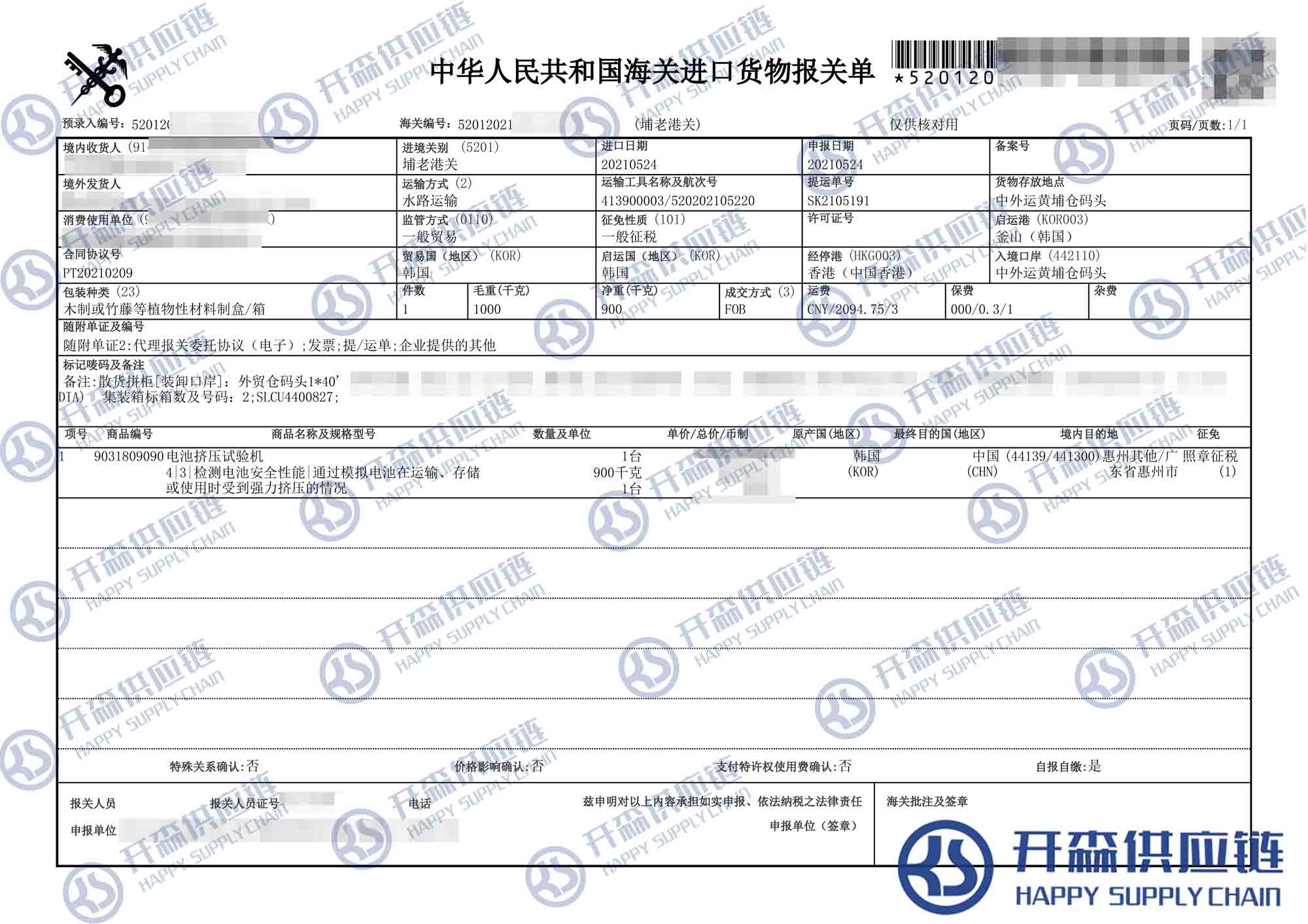 【導(dǎo)讀】您正在閱讀的是關(guān)于韓國電池擠壓試驗機進口報關(guān)代理服務(wù)【進口案例】的內(nèi)容,本文由開森機械進口報關(guān)代理小編整理編寫;