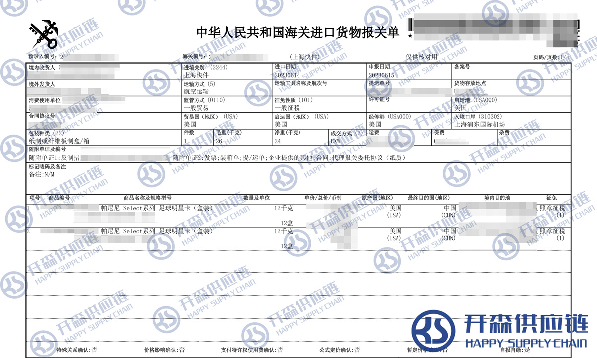 【本文結語】 上述就是上海機場球星卡進口報關代理服務【清關案例】的全部內容,希望能對您有所幫助,如有球星卡進口報關上任何疑問及問題可隨時在線聯系我們或撥打 18002611553,開森供應鏈擁有豐富的球星卡進口報關操作經驗及案例,10余年進口經驗為您所用,各類進口疑難都能為您一一解答及協助快速處理解決!