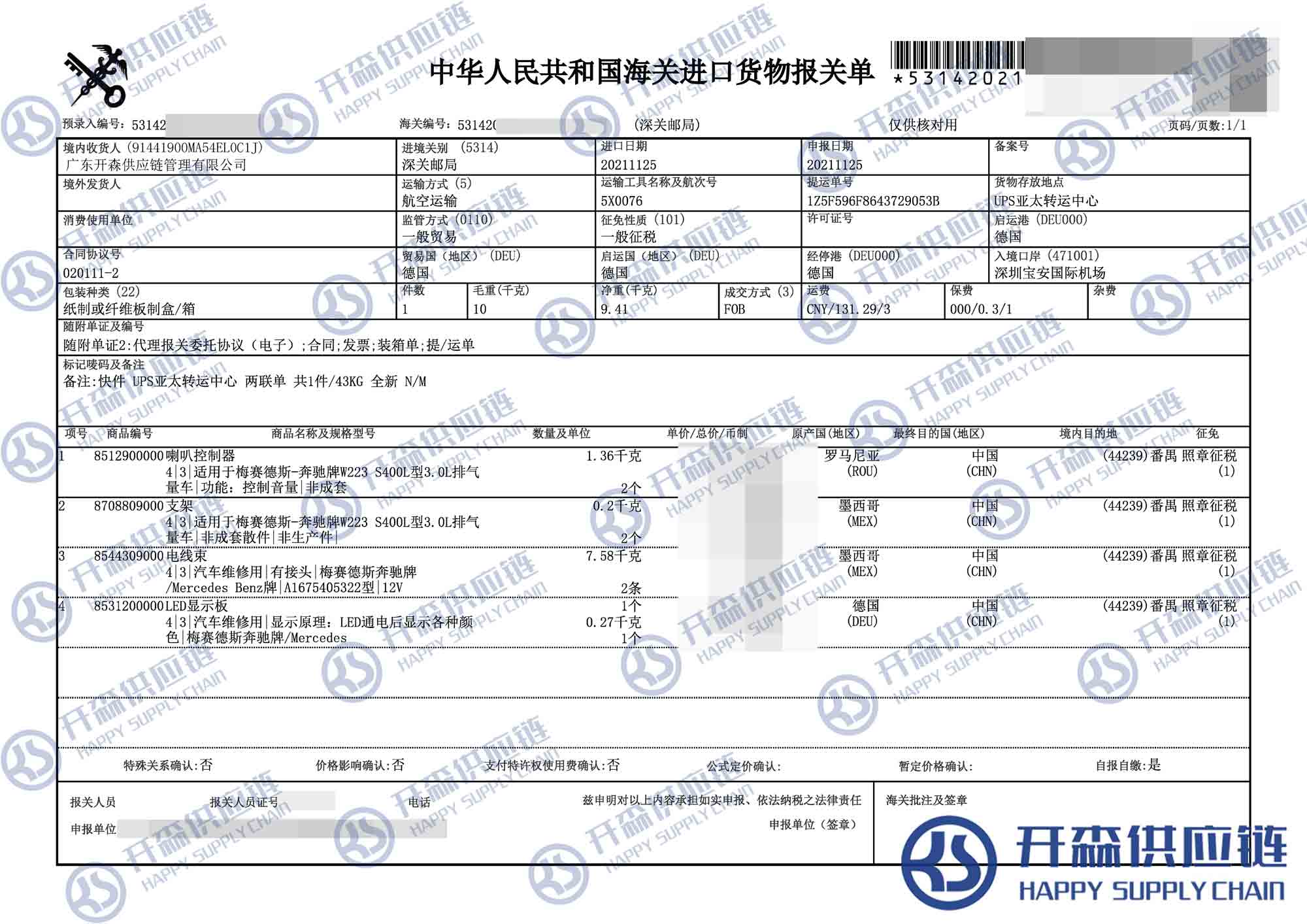 德國奔馳顯示板汽車配件進口報關(guān)代理【進口案例】