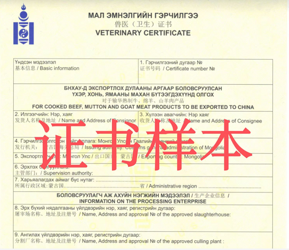 蒙古國官方已向中國海關總署備案確認蒙古國熟制牛羊肉產品獸醫衛生證書樣式、官方印章及官方獸醫簽字等相關信息。進口蒙古國熟制牛羊肉產品應附有蒙古國官方出具的獸醫衛生證書,并加蓋官方印章和官方獸醫簽字,同時向中國海關推送對應蒙古國輸華肉類衛生證書電子信息。